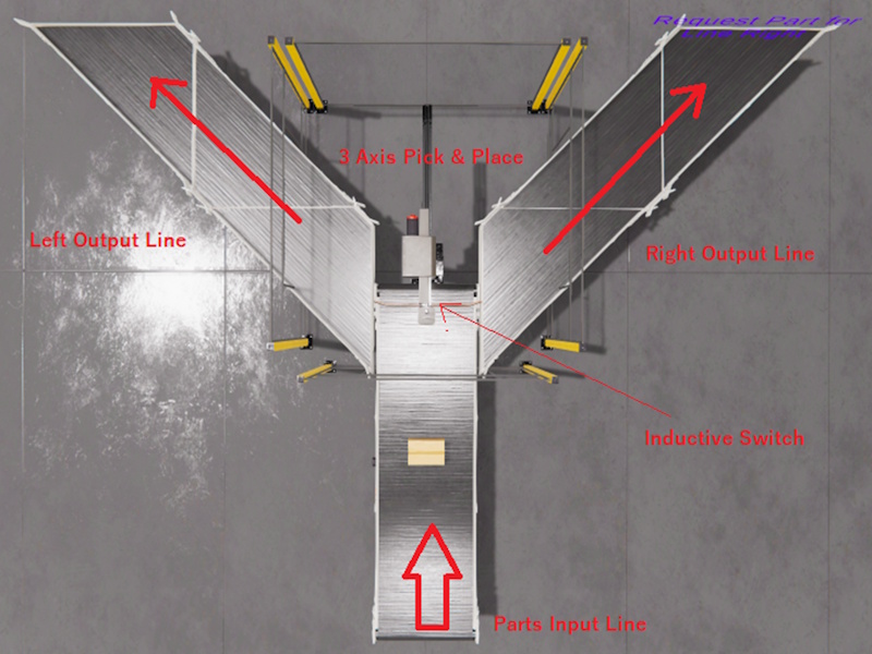 The cardboard boxes will come from the input line, once the inductive switch will detect the part (I.0), the PLC must to manage the Pick & Place arm in order to take the cardboard and place it in the line requested.